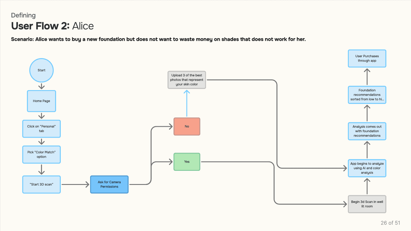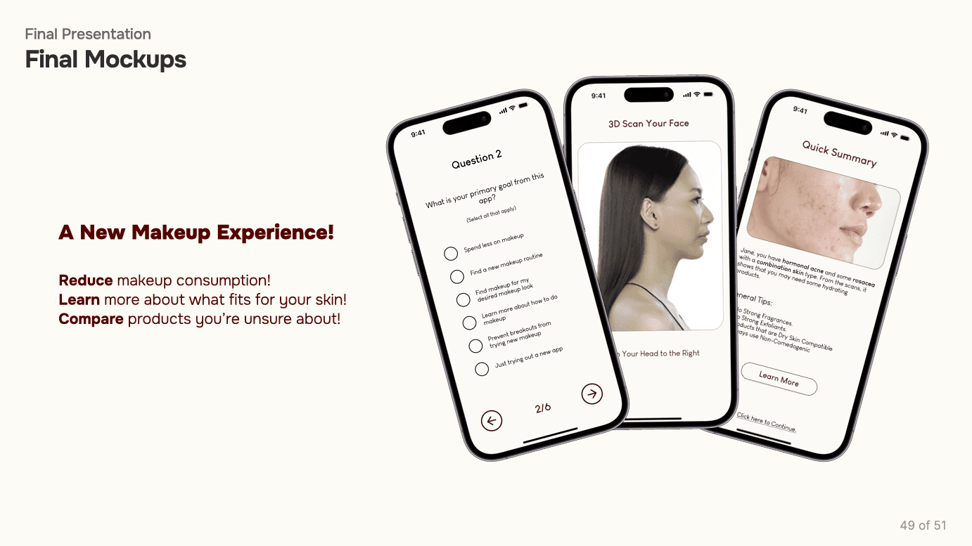 Many people—especially those with acne, eczema, or sensitive skin—struggle to find makeup that truly works for them. Existing tools like Sephora’s shade matcher, Yuka’s ingredient scanner, and AI‑based skin analyzers help, but none offer a fully personalized, skin‑condition‑aware experience. Research shows that 36–74% of users wear makeup to cover blemishes or skin conditions, 99% see visible improvement with corrective makeup, and most rely on online reviews, friends, and influencers when choosing products. With Americans spending over $1,700 a year on beauty—often wasted on mismatched or irritating products—there’s a clear need for a smarter solution.