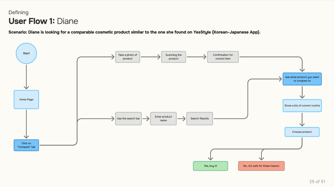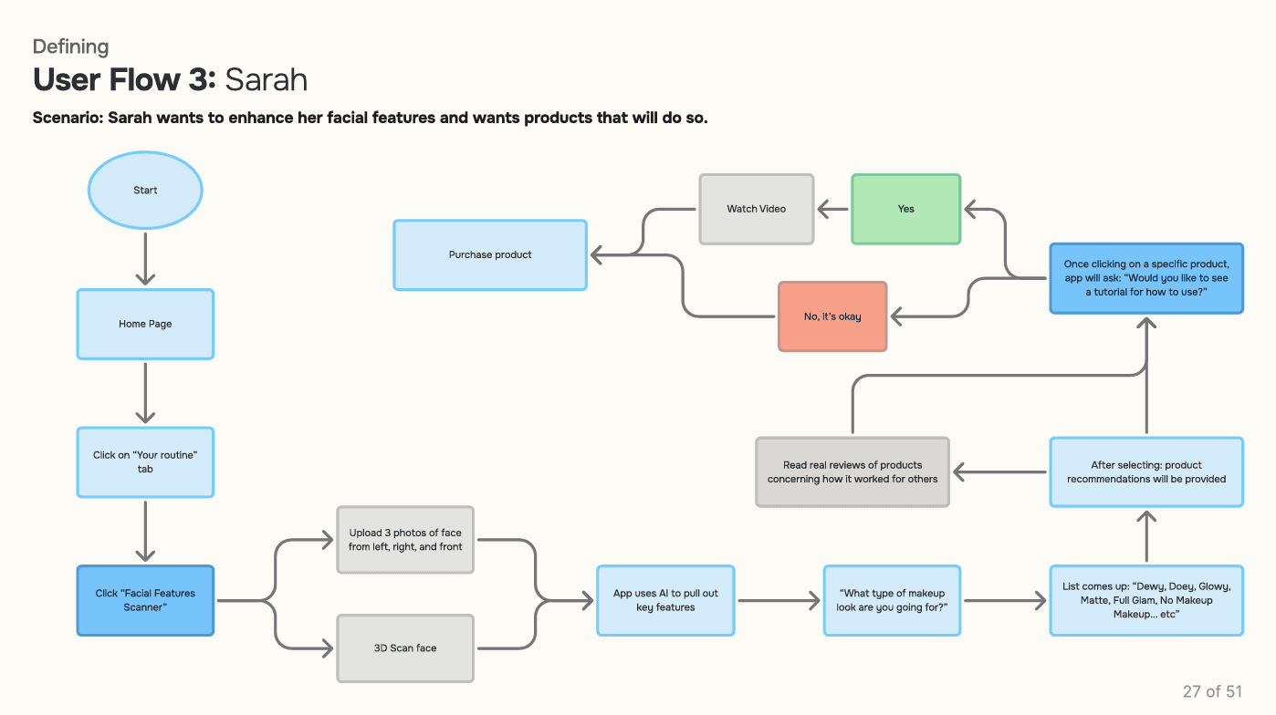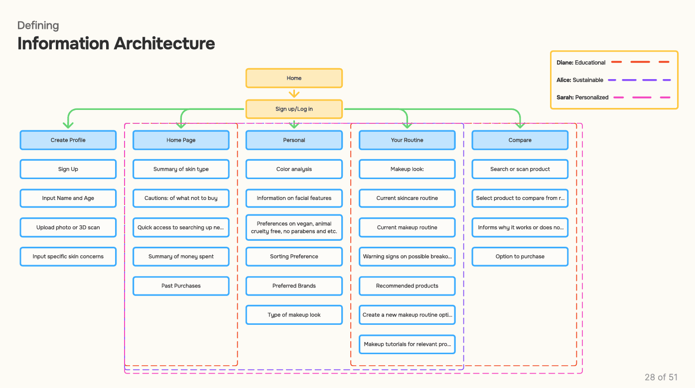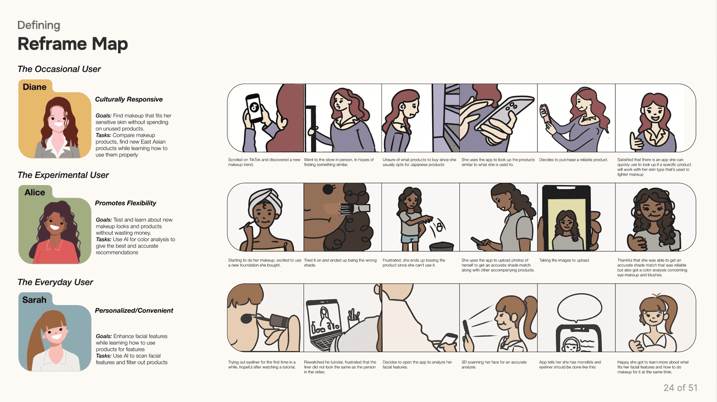 Across all interviews, users expressed a desire for personalized recommendations, cultural product variety (Korean, Japanese, Western), ingredient transparency, price filtering, and integrated tutorials. These insights reinforce the need for a system that’s not just smart—but sensitive to individual skin needs, preferences, and learning styles.
