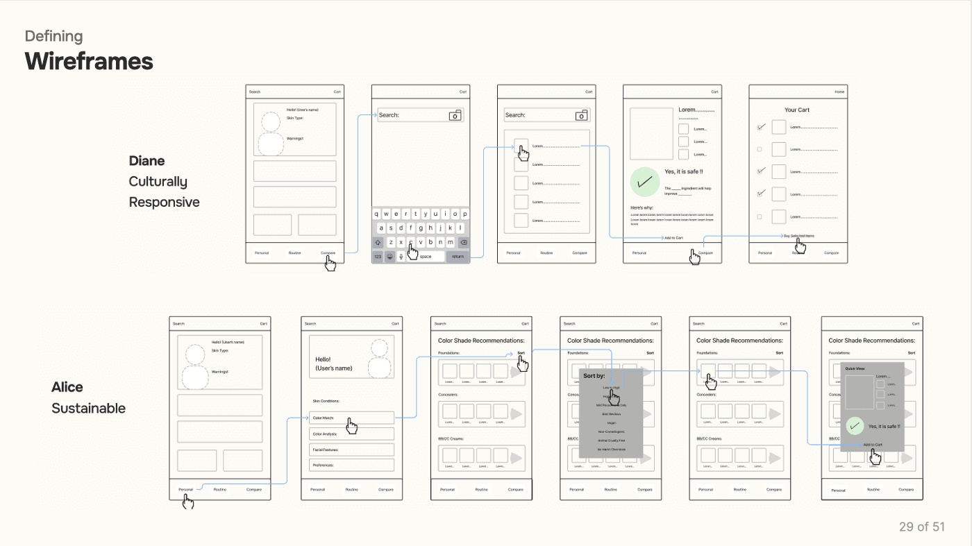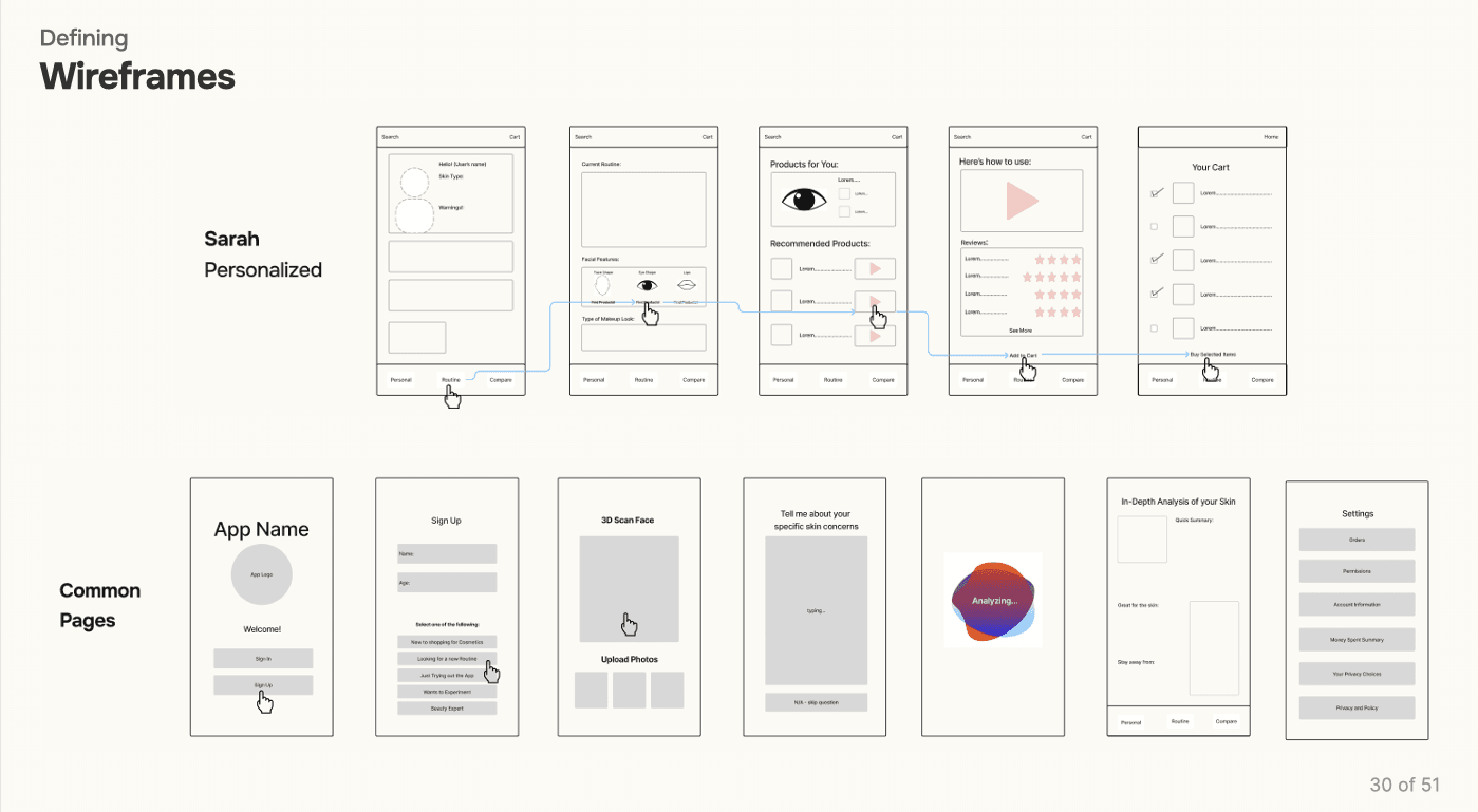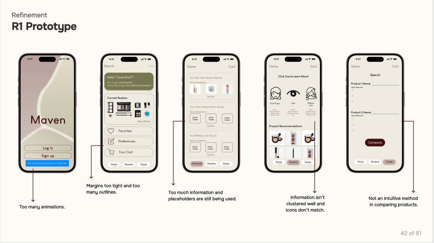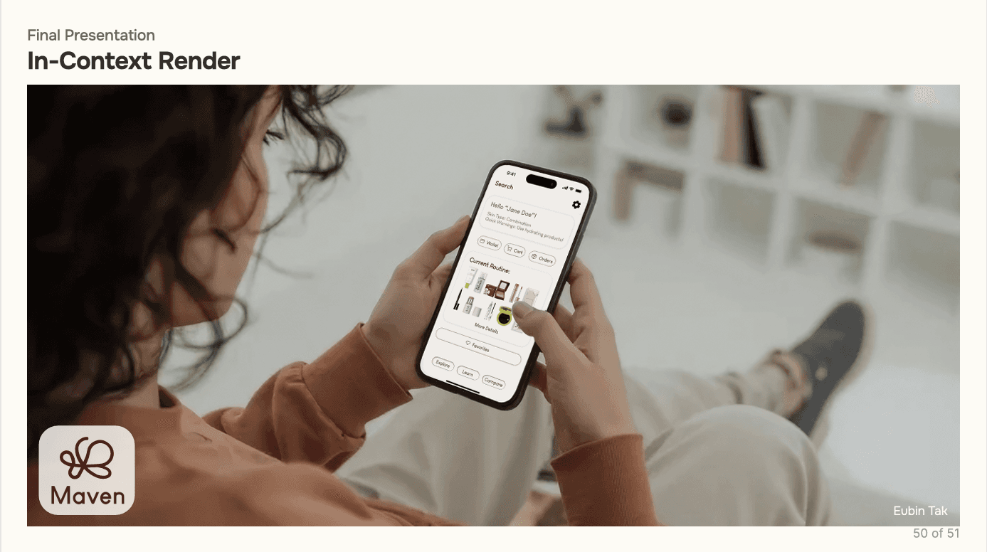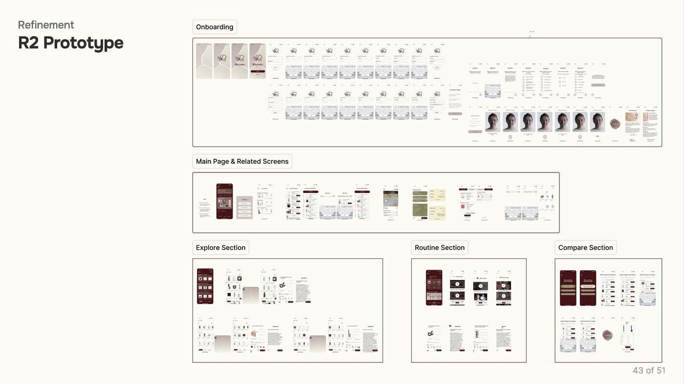 The prototype translated core features into an interactive flow, allowing users to explore personalized recommendations, product filtering, and integrated tutorials. Usability testing with participants surfaced key refinements—simplifying navigation, clarifying terminology, and improving the accuracy of skin‑type inputs. These iterations ensured the system felt intuitive, trustworthy, and aligned with real user needs.