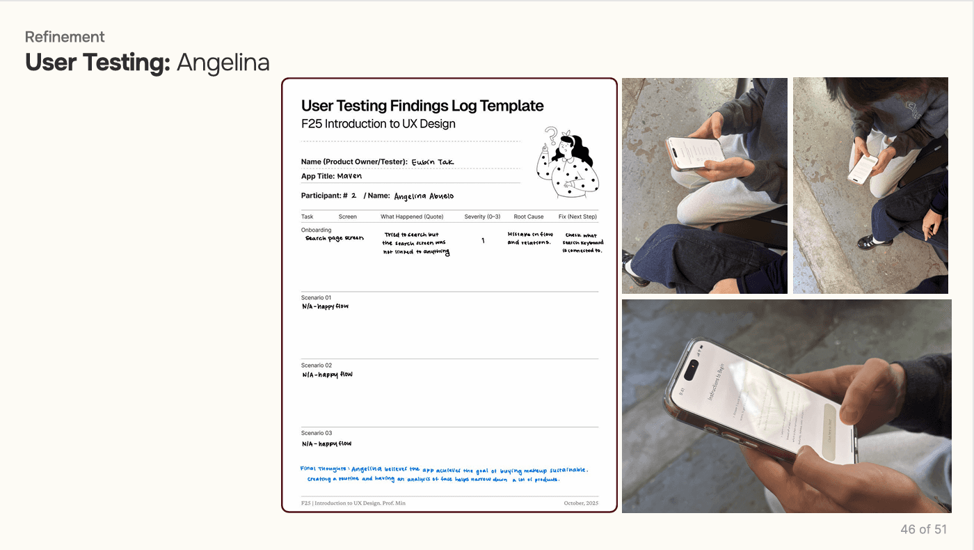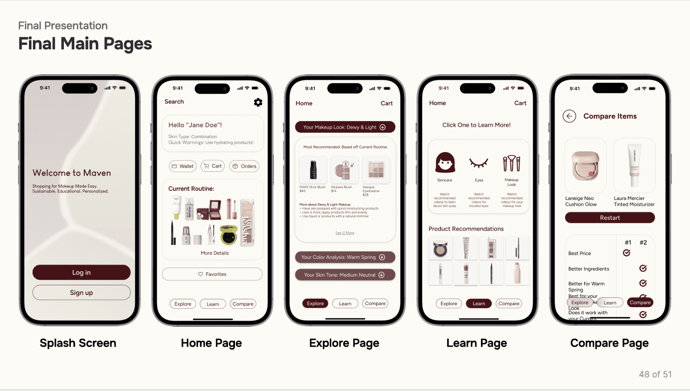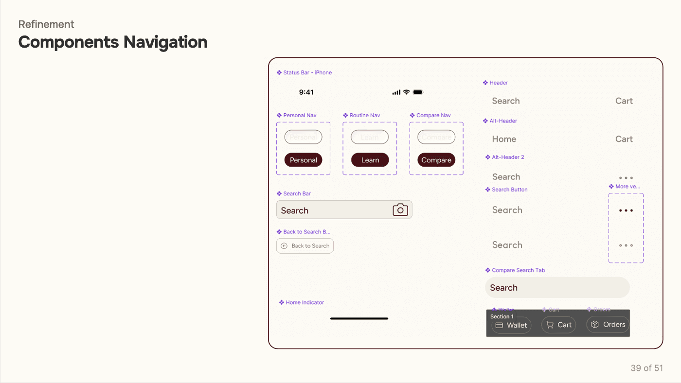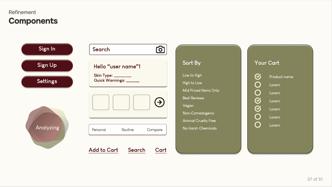 The prototype translated core features into an interactive flow, allowing users to explore personalized recommendations, product filtering, and integrated tutorials. Usability testing with participants surfaced key refinements—simplifying navigation, clarifying terminology, and improving the accuracy of skin‑type inputs. These iterations ensured the system felt intuitive, trustworthy, and aligned with real user needs.