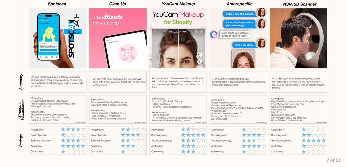 The current landscape of beauty tech is fragmented. Most apps fall into either unrealistic AR or generic recommendations, leaving a gap in tools that combine realistic AR with smart, skin-aware routines. This quadrant—currently underserved—is where our app thrives: offering personalized guidance that’s both technically accurate and emotionally resonant.
